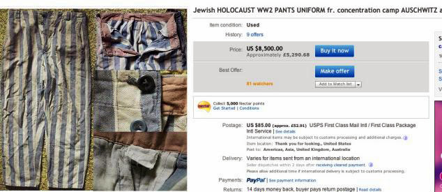 Αλγεινές εντυπώσεις προκάλεσε η αποκάλυψη βρετανικής εφημερίδας πως υπήρχαν χρήστες στο eBay οι οποίοι πουλούσαν μακάβρια κειμήλια από την φρικιαστική περίοδο του Ολοκαυτώματος, όταν χιλιάδες άνθρωποι έχασαν τη ζωή τους στα ναζιστικά στρατόπεδα συγκέντρωσης.Η